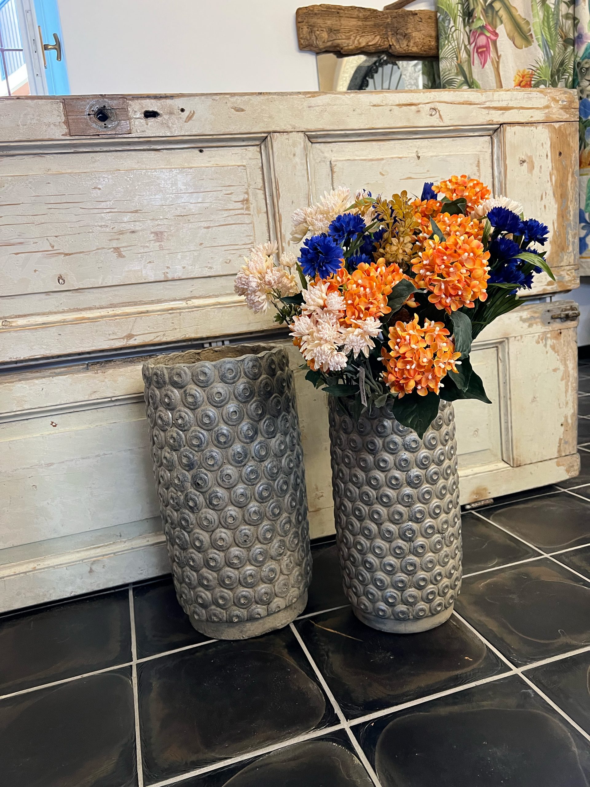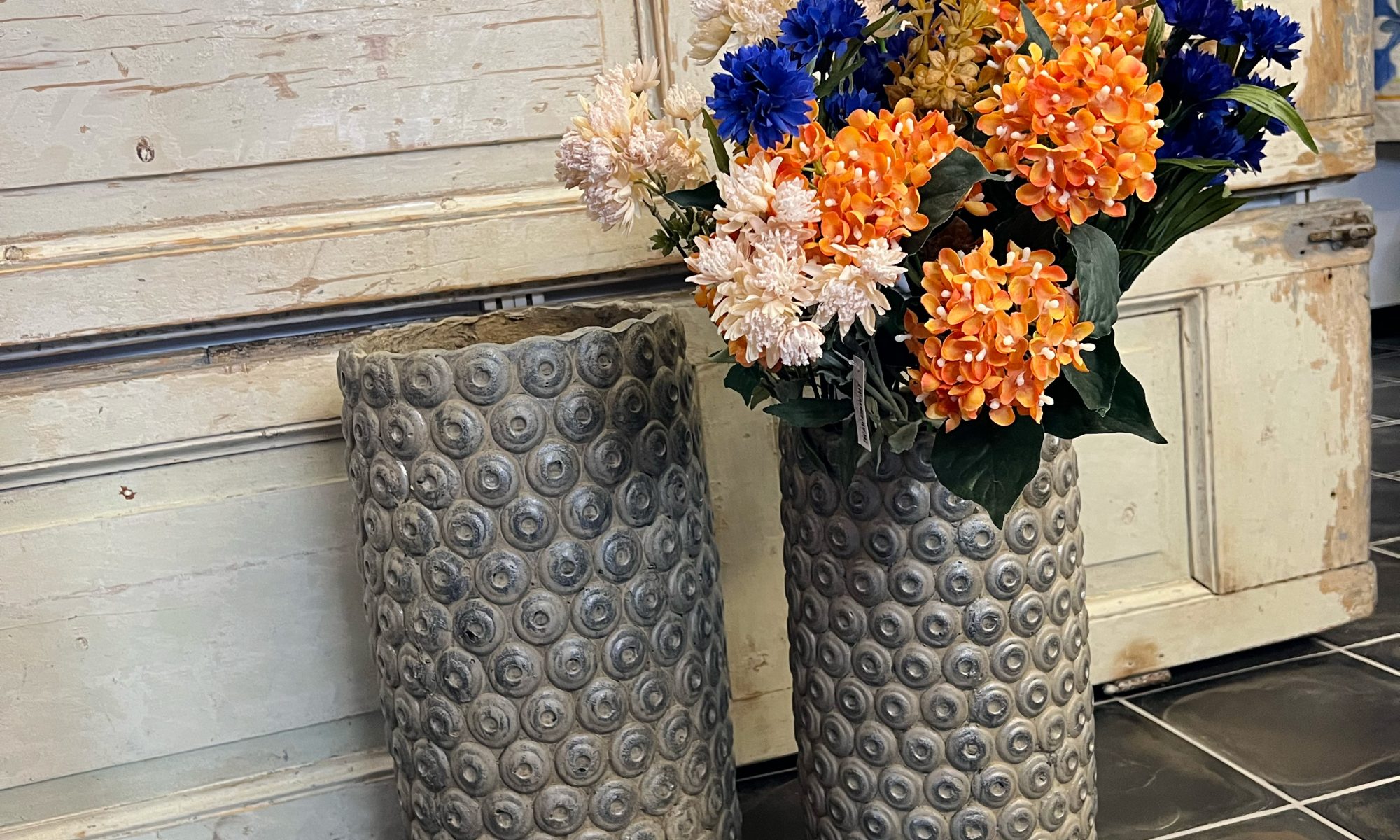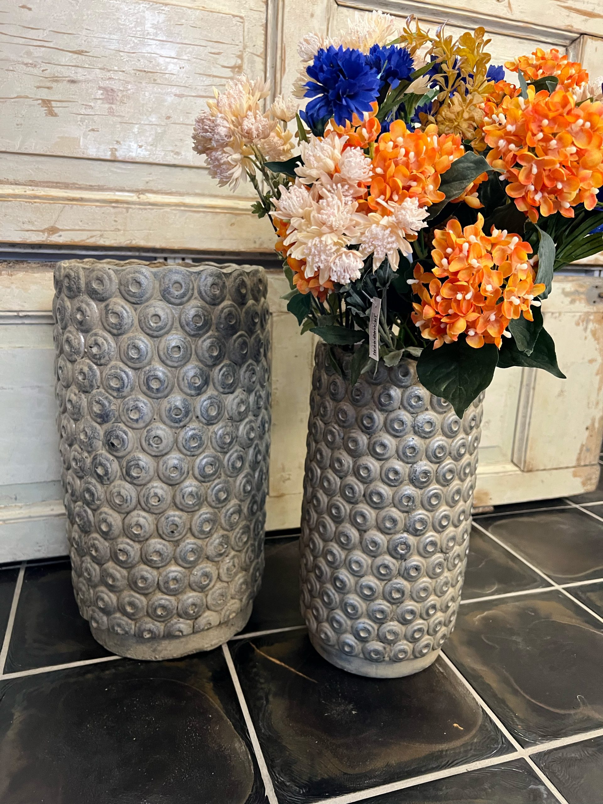 Vaso artigianale grigio per fiori fatto a mano in due dimensioni.